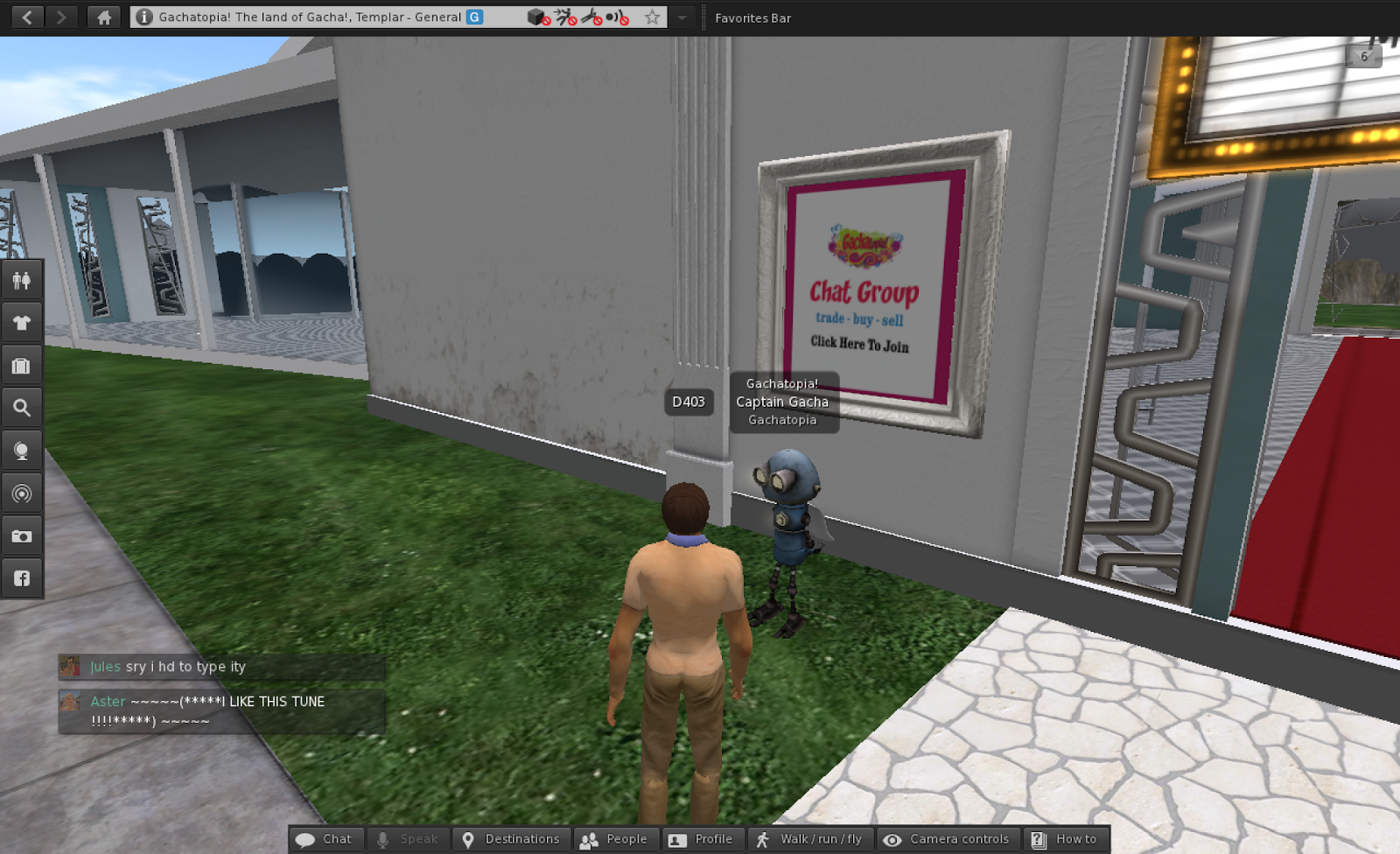 In the next world I first found the lady on top, which I wrote to but she didn't respond. Luckily after some exploring I found people sitting around listening to music and was even able to say hi!